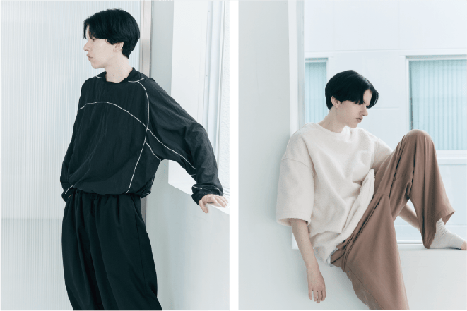 正円のパターンを曲線に曲げ、ほぼ縫い繋がず成形する “曲” や折ることで形作られていく “折”。