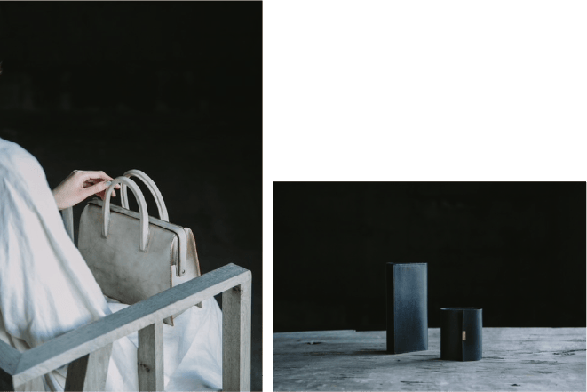 折る・曲げる・それに伴う革の反発や歪みを利用してバッグに成立させる石黒。